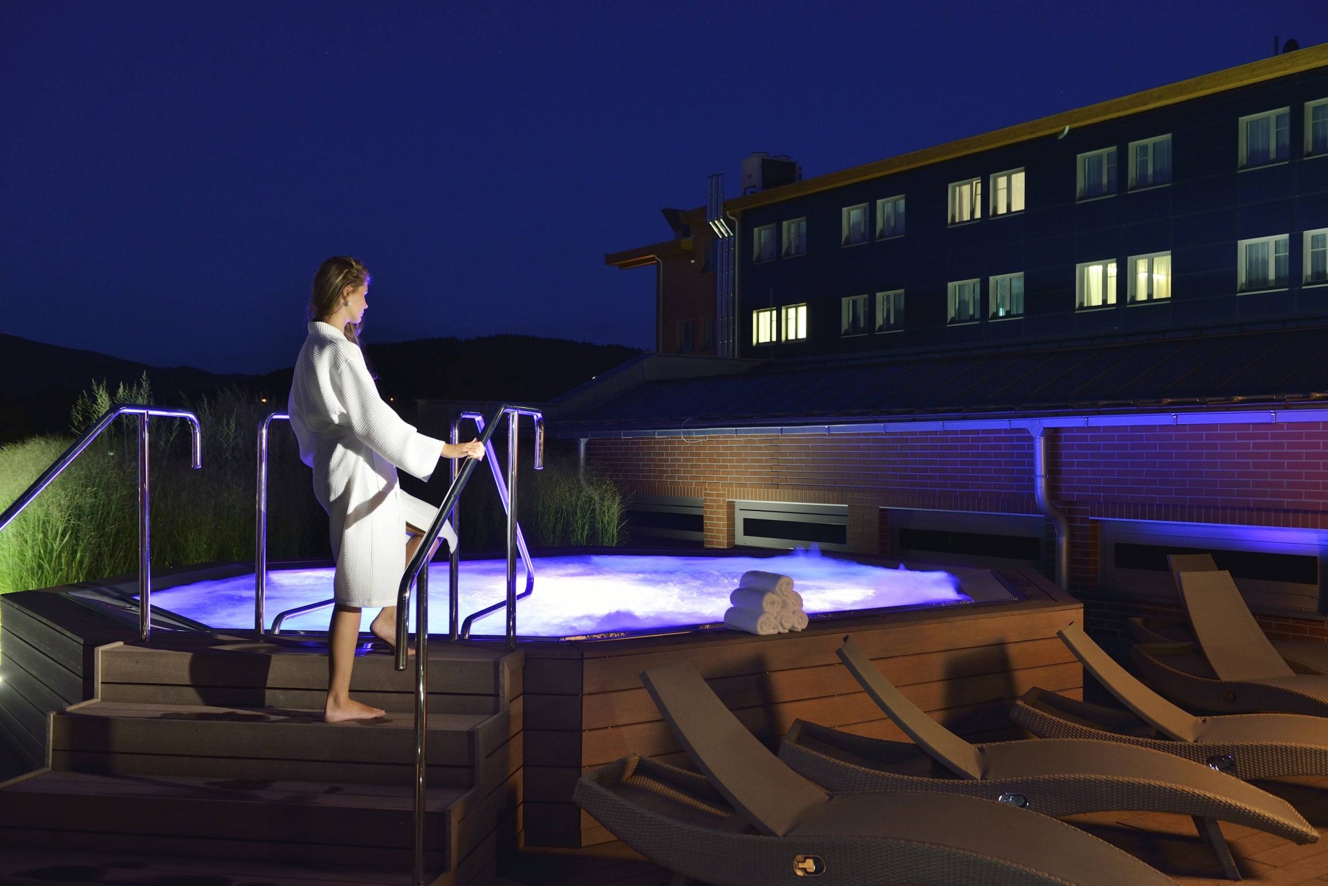 Střešní whirlpool pod hvězdnou oblohou je nevšední zážitek, který si můžete vychutnat spolu se širokou nabídkou relaxačních procedur našeho wellness & spa centra.